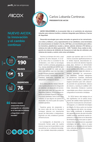 NUEVO AICOX, la innovaci%u00f3n y el cambio continuo%u201c Gracias a nuestro compromiso hemos conseguido ser referentes en el mercado de Defensa y Seguridad a nivel mundial%u201dAICOX SOLUCIONES es el proveedor l%u00edder en el suministro de soluciones robustas para entornos hostiles y sistemas integrados para Defensa y Fuerzas de Seguridad.Desarrolla tecnolog%u00edas para estos mercados en general en las comunicaciones civiles y militares, y muy especialmente en las satelitales, como terminales de comunicaciones en banda X, Ka, Ku, UHF fijas y en movimiento para veh%u00edculos terrestres, plataformas navales y a%u00e9reas; adem%u00e1s sistemas LTE t%u00e1cticos y sistemas de radio de %u00faltima generaci%u00f3n %u2013 SDR. Tambi%u00e9n Aicox realiza la integraci%u00f3n de sistemas de inhibici%u00f3n de frecuencia en todo tipo de veh%u00edculos y de sistemas de mando y control, entre otras actividades.Nacimos en tiempos de crisis y aqu%u00ed seguimos 35 a%u00f1os despu%u00e9s. A lo largo de estos a%u00f1os la sociedad ha ido cambiando y con ellos la tecnolog%u00eda, desde nuestros primeros proyectos a hoy, hemos recorrido un camino apasionante, poniendo en cada uno de ellos esos pilares que nos han mantenido siempre j%u00f3venes, seguimos con la misma ilusi%u00f3n, honestidad, responsabilidad, dedicaci%u00f3n, capacidad de adaptaci%u00f3n y trabajo en equipo.En la %u00faltima d%u00e9cada, hemos intensificado nuestra actividad en la integraci%u00f3n de sistemas y el desarrollo de tecnolog%u00edas avanzadas para los mercados de Seguridad, Defensa, con un enfoque especial en el %u00e1mbito Espacial y las comunicaciones satelitales, tanto civiles como militares. Lo que alguna vez parec%u00eda inalcanzable, hoy forma parte de nuestra realidad operativa. Nuestras ganas de emprender y de crecer cada d%u00eda nos ha llevado a conseguir alianzas con importantes grupos de fabricantes e integradores, logrando con ello, establecer grandes infraestructuras.La investigaci%u00f3n, el desarrollo y la innovaci%u00f3n forman parte de nuestra esencia, lo que nos ha permitido no solo convertirnos en un referente tecnol%u00f3gico, sino tambi%u00e9n desarrollar productos propios que aportan valor en el I+D+i. Hemos avanzado significativamente en el %u00e1mbito Espacial, desarrollando sistemas de control del dominio Espacial. Entre ellos, destacan un demostrador de jammer satelital para bandas militares en sat%u00e9lites LEO y GEO, y un sistema portable terrestre capaz de detectar y analizar anomal%u00edas en comunicaciones satelitales. Tambi%u00e9n trabajamos en plataformas CubeSats, dise%u00f1ando sistemas para pruebas y calificaci%u00f3n de equipos terrestres para LEO, abarcando precisi%u00f3n de apuntamiento, balance de enlaces y roaming en sat%u00e9lites LEO. Estos desarrollos fortalecen nuestras capacidades para ofrecer soluciones de vanguardia en escenarios complejos.En 2024 hemos sido testigos de un hito significativo con el exitoso lanzamiento del sat%u00e9lite militar SpainSat NG, un avance crucial para las comunicaciones seguras y la soberan%u00eda tecnol%u00f3gica de Espa%u00f1a. En Aicox, junto con muchas otras empresas del sector, nos enorgullece haber contribuido al despliegue del segmento terreno de este innovador sat%u00e9lite nacional, aportando nuestra experiencia y compromiso en el desarrollo de infraestructuras clave para su operatividad. Este logro refuerza la capacidad estrat%u00e9gica del pa%u00eds y marca un paso adelante en la consolidaci%u00f3n de Espa%u00f1a como referente en el %u00e1mbito aeroespacial y de defensa.PRESIDENTE DE AICOXCarlos Lobarda Contrerasperfil_de las empresas76millones de eurosINGRESOS13190EMPLEOSPAISES24