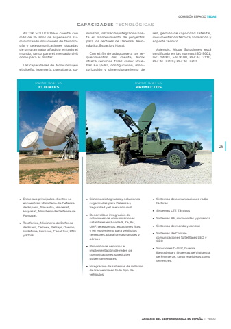 AICOX SOLUCIONES cuenta con m%u00e1s de 35 a%u00f1os de experiencia suministrando soluciones de tecnolog%u00eda y telecomunicaciones dotadas de un gran valor a%u00f1adido en todo el mundo, tanto para el mercado civil como para el militar.Las capacidades de Aicox incluyen el dise%u00f1o, ingenier%u00eda, consultor%u00eda, suministro, instalaci%u00f3n/integraci%u00f3n hasta el mantenimiento de proyectos para los sectores de Defensa, Aeron%u00e1utica, Espacio y Naval.Con el fin de adaptarse a los requerimientos del cliente, Aicox ofrece servicios tales como: Pruebas FAT/SAT, configuraci%u00f3n, monitorizaci%u00f3n y dimensionamiento de red, gesti%u00f3n de capacidad satelital, documentaci%u00f3n t%u00e9cnica, formaci%u00f3n y soporte t%u00e9cnico.Adem%u00e1s, Aicox Soluciones est%u00e1 certificada en las normas ISO 9001, ISO 14001, EN 9100, PECAL 2110, PECAL 2210 y PECAL 2310.%u2022 Sistemas integrados y soluciones rugerizadas para Defensa y Seguridad y el mercado civil%u2022 Desarrollo e integraci%u00f3n de soluciones de comunicaciones satelitales en banda X, Ka, Ku, UHF, telepuertos, estaciones fijas y en movimiento para veh%u00edculos terrestres, plataformas navales y a%u00e9reas%u2022 Provisi%u00f3n de servicios e implementaci%u00f3n de redes de comunicaciones satelitales gubernamentales%u2022 Integraci%u00f3n de sistemas de inibici%u00f3n de frecuencia en todo tipo de veh%u00edculos%u2022 Sistemas de comunicaciones radio t%u00e1cticas%u2022 Sistemas LTE T%u00e1cticos%u2022 Sistemas RF, microondas y potencia%u2022 Sistemas de mando y control%u2022 Sistemas de Contracomunicaciones Satelitales LEO y GEO%u2022 Soluciones C-UxV, Guerra Electr%u00f3nica y Sistemas de Vigilancia de Fronteras, tanto mar%u00edtimas como terrestres.%u2022 Entre sus principales clientes se encuentran: Ministerio de Defensa de Espa%u00f1a, Navantia, Hisdesat, Hispasat, Ministerio de Defensa de Portugal.%u2022 Telef%u00f3nica, Ministerio de Defensa de Brasil, Cellnex, Itelzapi, Overon, Vodafone, Ericsson, Canal Sur, RNE y RTVE.PRINCIPALESPROYECTOSPRINCIPALESCLIENTESCAPACIDADES TECNOL%u00d3GICASANUARIO DEL SECTOR ESPACIAL EN ESPA%u00d1A I TEDAE25COMISI%u00d3N ESPACIO TEDAE