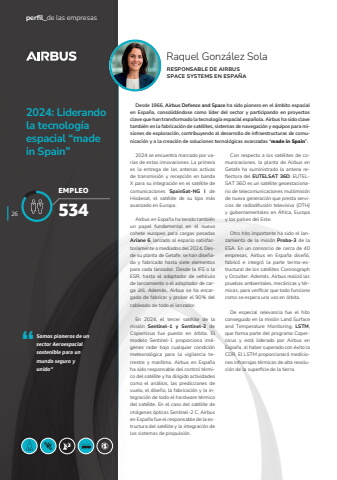 2024: Liderando la tecnolog%u00eda espacial %u201cmadein Spain%u201d%u201c Somos pioneros de un sector Aeroespacial sostenible para un mundo seguro y unido%u201dDesde 1966, Airbus Defence and Space ha sido pionero en el %u00e1mbito espacial en Espa%u00f1a, consolid%u00e1ndose como l%u00edder del sector y participando en proyectos clave que han transformado la tecnolog%u00eda espacial espa%u00f1ola. Airbus ha sido clave tambi%u00e9n en la fabricaci%u00f3n de sat%u00e9lites, sistemas de navegaci%u00f3n y equipos para misiones de exploraci%u00f3n, contribuyendo al desarrollo de infraestructuras de comunicaci%u00f3n y a la creaci%u00f3n de soluciones tecnol%u00f3gicas avanzadas %u201cmade in Spain%u201d. 2024 se encuentra marcado por varias de estas innovaciones. La primera es la entrega de las antenas activas de transmisi%u00f3n y recepci%u00f3n en banda X para su integraci%u00f3n en el sat%u00e9lite de comunicaciones SpainSat-NG I de Hisdesat, el sat%u00e9lite de su tipo m%u00e1s avanzado en Europa. Airbus en Espa%u00f1a ha tenido tambi%u00e9n un papel fundamental en el nuevo cohete europeo para cargas pesadas Ariane 6, lanzado al espacio satisfactoriamente a mediados del 2024. Desde su planta de Getafe, se han dise%u00f1ado y fabricado hasta siete elementos para cada lanzador. Desde la IFS o la ESR, hasta el adaptador de veh%u00edculo de lanzamiento o el adaptador de carga %u00fatil. Adem%u00e1s, Airbus se ha encargado de fabricar y probar el 90% del cableado de todo el lanzador.En 2024, el tercer sat%u00e9lite de la misi%u00f3n Sentinel-1 y Sentinel-2 de Copernicus fue puesto en %u00f3rbita. El modelo Sentinel-1 proporciona im%u00e1genes radar bajo cualquier condici%u00f3n meteorol%u00f3gica para la vigilancia terrestre y mar%u00edtima. Airbus en Espa%u00f1a ha sido responsable del control t%u00e9rmico del sat%u00e9lite y ha dirigido actividades como el an%u00e1lisis, las predicciones de vuelo, el dise%u00f1o, la fabricaci%u00f3n y la integraci%u00f3n de todo el hardware t%u00e9rmico del sat%u00e9lite. En el caso del sat%u00e9lite de im%u00e1genes %u00f3pticas Sentinel-2 C, Airbus en Espa%u00f1a fue el responsable de la estructura del sat%u00e9lite y la integraci%u00f3n de los sistemas de propulsi%u00f3n.Con respecto a los sat%u00e9lites de comunicaciones, la planta de Airbus en Getafe ha suministrado la antena reflectora del EUTELSAT 36D. EUTELSAT 36D es un sat%u00e9lite geoestacionario de telecomunicaciones multimisi%u00f3n de nueva generaci%u00f3n que presta servicios de radiodifusi%u00f3n televisiva (DTH) y gubernamentales en %u00c1frica, Europa y los pa%u00edses del Este. Otro hito importante ha sido el lanzamiento de la misi%u00f3n Proba-3 de la ESA. En un consorcio de cerca de 40 empresas, Airbus en Espa%u00f1a dise%u00f1%u00f3, fabric%u00f3 e integr%u00f3 la parte termo-estructural de los sat%u00e9lites Coronograph y Occulter. Adem%u00e1s, Airbus realiz%u00f3 las pruebas ambientales, mec%u00e1nicas y t%u00e9rmicas, para verificar que todo funcione como se espera una vez en %u00f3rbita.De especial relevancia fue el hito conseguido en la misi%u00f3n Land Surface and Temperature Monitoring, LSTM, que forma parte del programa Copernicus y est%u00e1 liderado por Airbus en Espa%u00f1a, al haber superado con %u00e9xito la CDR. El LSTM proporcionar%u00e1 mediciones infrarrojas t%u00e9rmicas de alta resoluci%u00f3n de la superficie de la tierra. RESPONSABLE DE AIRBUS SPACE SYSTEMS EN ESPA%u00d1ARaquel Gonz%u00e1lez Solaperfil_de las empresas534EMPLEO26