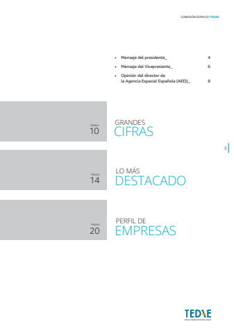 GRANDES%u2022 Mensaje del presidente_ 4%u2022 Mensaje del Vicepresiente_ 6%u2022 Opini%u00f3n del director dela Agencia Espacial Espa%u00f1ola (AEE))_ 8CIFRASEMPRESASPERFIL DE DESTACADOLO M%u00c1S101420P%u00c1GINAP%u00c1GINAP%u00c1GINA3COMISI%u00d3N ESPACIO TEDAE