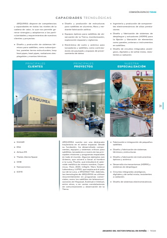 ARQUIMEA dispone de competencias y capacidades en todos los niveles de la cadena de valor, lo que nos permite generar sinergias y adaptarnos a las particularidades y requerimientos de nuestros clientes y proyectos:%u2022 Dise%u00f1o y producci%u00f3n de sistemas t%u00e9rmicos para sat%u00e9lites, como subconjuntos, paneles termo estructurales, loop heat pipes, heat pipes, radiadores desplegables y mantas t%u00e9rmicas.%u2022 Dise%u00f1o y producci%u00f3n de estructuras para sat%u00e9lites en aluminio, fibra y mediante fabricaci%u00f3n aditiva%u2022 Equipos %u00f3pticos para sat%u00e9lites de observaci%u00f3n de la Tierra, monitorizaci%u00f3n, exploraci%u00f3n espacial y vigilancia.%u2022 Electr%u00f3nica de vuelo y avi%u00f3nica para lanzadores y sat%u00e9lites, como controladores de payloads y equipos de procesamiento de datos %u2022 Ingenier%u00eda y producci%u00f3n de componentes electromec%u00e1nicos de altas prestaciones%u2022 Dise%u00f1o y fabricaci%u00f3n de sistemas de despliegue y actuadores (HDRM) para la fijaci%u00f3n y liberaci%u00f3n de elementos como paneles, antenas o instrumentos en sat%u00e9lites.%u2022 Dise%u00f1o de circuitos integrados anal%u00f3gicos, digitales y de se%u00f1al mixta, resistentes a radiaci%u00f3n.ARQUIMEA cuenta con una destacada trayectoria en el sector espacial. Desde su fundaci%u00f3n, ha desarrollado componentes, equipos y sistemas cr%u00edticos para sat%u00e9lites, lanzadores o rovers de las principales misiones y programas espaciales en todo el mundo. Algunos ejemplos son Artemis, que volver%u00e1 a llevar al hombre a la Luna; Psyche, que estudiar%u00e1 el asteroide met%u00e1lico de mismo nombre, Copernicus; Mars 2020; InSight; Mars Science Laboratory; LUPEX, que explorar%u00e1 el polo sur de la Luna, o SPAINSAT NG. Adem%u00e1s, las tecnolog%u00edas de ARQUIMEA se utilizan recurrentemente en programas comerciales, como los sat%u00e9lites de telecomunicaciones de Hispasat, Eutelsat e Intelsat, entre otros, o en varias constelaciones de comunicaciones y observaci%u00f3n de la Tierra.%u2022 Fabricaci%u00f3n e integraci%u00f3n de peque%u00f1os sat%u00e9lites%u2022 Dise%u00f1o y fabricaci%u00f3n de sistemas t%u00e9rmicos y estructuras%u2022 Dise%u00f1o y fabricaci%u00f3n de instrumentos %u00f3pticos y avi%u00f3nica%u2022 Desarrollo de mecanismos (HDRM) y sistemas de despliegue%u2022 Circuitos integrados anal%u00f3gicos, digitales y de se%u00f1al mixta, resistentes a radiaci%u00f3n.%u2022 Dise%u00f1o de sistemas electromec%u00e1nicos.%u2022 MAXAR%u2022 ESA%u2022 Airbus DS%u2022 Thales Alenia Space%u2022 OHB%u2022 Nanoavionics%u2022 ICEYECAPACIDADES TECNOL%u00d3GICASANUARIO DEL SECTOR ESPACIAL EN ESPA%u00d1A I TEDAEPRINCIPALESPROYECTOSPRINCIPALESCLIENTESNUESTRAESPECIALIZACI%u00d3N31COMISI%u00d3N ESPACIO TEDAE