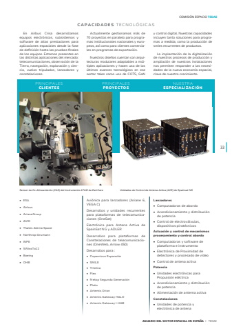 ANUARIO DEL SECTOR ESPACIAL EN ESPA%u00d1A I TEDAEEn Airbus Crisa desarrollamos equipos electr%u00f3nicos, subsistemas y software de altas prestaciones para aplicaciones espaciales desde la fase de definici%u00f3n hasta las pruebas finales de los equipos. Estamos presentes en las distintas aplicaciones del mercado: telecomunicaciones, observaci%u00f3n de la Tierra, navegaci%u00f3n, exploraci%u00f3n y ciencia, vuelos tripulados, lanzadores y constelaciones.Actualmente gestionamos m%u00e1s de 70 proyectos en paralelo para programas institucionales nacionales y europeos, as%u00ed como para clientes comerciales en programas de exportaci%u00f3n.Nuestros dise%u00f1os cuentan con arquitecturas modulares adaptables a m%u00faltiples aplicaciones y hacen uso de los %u00faltimos avances tecnol%u00f3gicos en ese sector tales como uso de COTS, GaN y control digital. Nuestras capacidades incluyen tanto soluciones para programas a medida, como la producci%u00f3n de series recurrentes de productos.La implantaci%u00f3n de la digitalizaci%u00f3n de nuestros procesos de producci%u00f3n y ampliaci%u00f3n de nuestras instalaciones nos permiten responder a las necesidades de la nueva econom%u00eda espacial, clave de nuestro crecimiento.Avi%u00f3nica para lanzadores (Ariane 6, VEGA C)Desarrollos y unidades recurrentes para plataformas de telecomunicaciones (OneSat)Electr%u00f3nica para Antena Activa de SpainSat NG y ADLERDesarrollos para plataformas de Constelaciones de telecomunicaciones (OneWeb, Arrow 450)Desarrollos para :%u2022 Copernicus Expansi%u00f3n%u2022 SMILE%u2022 Trishna%u2022 Flex%u2022 Metop Segunda Generaci%u00f3n%u2022 Plato%u2022 Artemis Orion%u2022 Artemis Gateway HALO%u2022 Artemis Gateway I-HABLanzadores%u2022 Computadoras de abordo%u2022 Acondicionamiento y distribuci%u00f3n de potencia%u2022 Control de electrov%u00e1lvulas, dispositivos pirot%u00e9cnicosActuaci%u00f3n y control de mecanismos procesamiento y control abordo%u2022 Computadoras y software de plataforma e instrumento%u2022 Electr%u00f3nica de Proximidad de detectores y procesado de v%u00eddeo%u2022 Control de antena activaPotencia%u2022 Unidades electr%u00f3nicas para Propulsi%u00f3n el%u00e9ctrica%u2022 Acondicionamiento y distribuci%u00f3n de potencia%u2022 Alimentaci%u00f3n de antema activaConstelaciones%u2022 Unidades de potencia y electr%u00f3nica de antena%u2022 ESA%u2022 Airbus%u2022 ArianeGroup%u2022 AVIO%u2022 Thales Alenia Space%u2022 Northrop Grumann%u2022 INPE%u2022 SWissTo12%u2022 Boeing%u2022 OHBPRINCIPALESPROYECTOSPRINCIPALESCLIENTESCAPACIDADES TECNOL%u00d3GICASSensor de Co-Alineamiento (CAS) del instrumento ATLID de EartCare Unidades de Control de Antena Activa (ACE) de Spainsat NGNUESTRAESPECIALIZACI%u00d3N33COMISI%u00d3N ESPACIO TEDAE