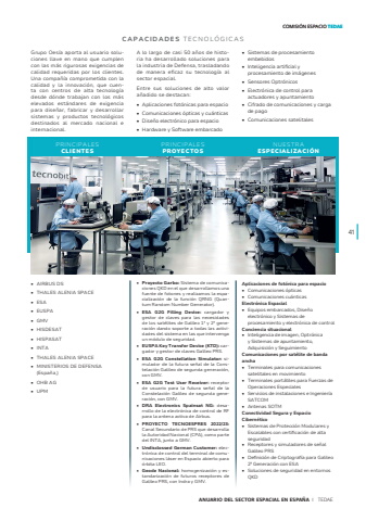 ANUARIO DEL SECTOR ESPACIAL EN ESPA%u00d1A I TEDAEGrupo Oes%u00eda aporta al usuario soluciones llave en mano que cumplen con las m%u00e1s rigurosas exigencias de calidad requeridas por los clientes. Una compa%u00f1%u00eda comprometida con la calidad y la innovaci%u00f3n, que cuenta con centros de alta tecnolog%u00eda desde d%u00f3nde trabajan con los m%u00e1s elevados est%u00e1ndares de exigencia para dise%u00f1ar, fabricar y desarrollar sistemas y productos tecnol%u00f3gicos destinados al mercado nacional e internacional. A lo largo de casi 50 a%u00f1os de historia ha desarrollado soluciones para la industria de Defensa, trasladando de manera eficaz su tecnolog%u00eda al sector espacial. Entre sus soluciones de alto valor a%u00f1adido se destacan: %u2022 Aplicaciones fot%u00f3nicas para espacio%u2022 Comunicaciones %u00f3pticas y cu%u00e1nticas%u2022 Dise%u00f1o electr%u00f3nico para espacio %u2022 Hardware y Software embarcado %u2022 Sistemas de procesamiento embebidos %u2022 Inteligencia artificial y procesamiento de im%u00e1genes %u2022 Sensores Optr%u00f3nicos %u2022 Electr%u00f3nica de control para actuadores y apuntamiento %u2022 Cifrado de comunicaciones y carga de pago %u2022 Comunicaciones satelitales %u2022 Proyecto Garbo: Sistema de comunicaciones QKD en el que desarrollamos una fuente de fotones y realizamos la espacializaci%u00f3n de la funci%u00f3n QRNG (Quantum Random Number Generator). %u2022 ESA G2G Filling Device: cargador y gestor de claves para las necesidades de los sat%u00e9lites de Galileo 1%u00aa y 2%u00aa generaci%u00f3n dando soporte a todas las actividades del sistema en las que intervenga un m%u00f3dulo de seguridad. %u2022 EUSPA Key Transfer Device (KTD): cargador y gestor de claves Galileo PRS. %u2022 ESA G2G Constellation Simulator: simulador de la futura se%u00f1al de la Constelaci%u00f3n Galileo de segunda generaci%u00f3n, con GMV. %u2022 ESA G2G Test User Receiver: receptor de usuario para la futura se%u00f1al de la Constelaci%u00f3n Galileo de segunda generaci%u00f3n, con GMV. %u2022 DRA Electronics Spainsat NG: desarrollo de la electr%u00f3nica de control de RF para la antena activa de Airbus. %u2022 PROYECTO TECNOESPRES 2022/23:Canal Secundario de PRS que desarrolla la Autoridad Nacional (CPA), como parte del INTA, junto a GMV. %u2022 Undisclossed German Customer: electr%u00f3nica de control del terminal de comunicaciones l%u00e1ser en Espacio abierto para %u00f3rbita LEO. %u2022 Geode Nacional: homogenizaci%u00f3n y estandarizaci%u00f3n de futuros receptores de Galileo PRS, con Indra y GMV. %u2022 AIRBUS DS %u2022 THALES ALENIA SPACE%u2022 ESA %u2022 EUSPA %u2022 GMV %u2022 HISDESAT %u2022 HISPASAT %u2022 INTA %u2022 THALES ALENIA SPACE %u2022 MINISTERIOS DE DEFENSA (Espa%u00f1a,) %u2022 OHB AG %u2022 UPMAplicaciones de fot%u00f3nica para espacio%u2022 Comunicaciones %u00f3pticas%u2022 Comunicaciones cu%u00e1nticasElectr%u00f3nica Espacial %u2022 Equipos embarcados, Dise%u00f1o electr%u00f3nico y Sistemas de procesamiento y electr%u00f3nica de control Conciencia situacional %u2022 Inteligencia de imagen, Optr%u00f3nica y Sistemas de apuntamiento, Adquisici%u00f3n y Seguimiento Comunicaciones por sat%u00e9lite de banda ancha %u2022 Terminales para comunicaciones satelitales en movimiento%u2022 Terminales port%u00e1tiles para Fuerzas de Operaciones Especiales %u2022 Servicios de instalaciones e Ingenier%u00eda SATCOM%u2022 Antenas SOTM Conectividad Segura y Espacio Cibern%u00e9tico %u2022 Sistemas de Protecci%u00f3n Modulares y Escalables con certificaci%u00f3n de alta seguridad%u2022 Receptores y simuladores de se%u00f1al Galileo PRS%u2022 Definici%u00f3n de Criptograf%u00eda para Galileo 2%u00aa Generaci%u00f3n con ESA%u2022 Soluciones de seguridad en entornos QKDPRINCIPALESPROYECTOSPRINCIPALESCLIENTESCAPACIDADES TECNOL%u00d3GICASNUESTRAESPECIALIZACI%u00d3N41COMISI%u00d3N ESPACIO TEDAE