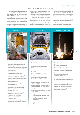 Comunicaciones gubernamentales seguras por sat%u00e9lite con cobertura en dos terceras partes de la Tierra: Programa SPAINSAT NG, los sat%u00e9lites de comunicaciones seguras m%u00e1s avanzados de Europa, que proporcionan servicios en bandas X, Ka Militar y UHF de manera flexible y con m%u00e1xima protecci%u00f3n ante interferencias, jamming y otros riesgos (como eventos nucleares a alta altitud) gracias a su innovadora tecnolog%u00eda de antenas activas. SPAINSAT NG I, lanzado en enero de 2025, y SPAINSAT NG II posicionan a Hisdesat y a la industria aeroespacial espa%u00f1ola a la vanguardia de la tecnolog%u00eda espacial.Observaci%u00f3n de la Tierra: el sat%u00e9lite radar PAZ ofrece im%u00e1genes de muy alta resoluci%u00f3n (hasta 25 cm) bajo cualquier condici%u00f3n lum%u00ednica o meteorol%u00f3gica, %u00f3ptimas para muy diversas aplicaciones (inteligencia, vigilancia mar%u00edtima, control de fronteras%u2026).Sistema de Informaci%u00f3n Autom%u00e1tico del tr%u00e1fico mar%u00edtimo por Sat%u00e9lite (S-AIS): este sistema permite conocer y monitorizar la situaci%u00f3n del tr%u00e1fico mar%u00edtimo mundial en tiempo real.Centro de Control de Sat%u00e9lites (SCC): nuevo centro de control de sat%u00e9lites para las operaciones de TT&C de la constelaci%u00f3n SPAINSAT NG, as%u00ed como para servicios de anclaje para naciones aliadas.%u2022 Comunicaciones seguras para el Ministerio de Defensa.%u2022 Comunicaciones seguras para la OTAN.%u2022 Programas GOVSATCOM de la CE y de la EDA. %u2022 Programa IRIS2 de la Comisi%u00f3n Europea.%u2022 Comunicaciones seguras para las Fuerzas Armadas de Portugal.%u2022 Comunicaciones seguras para la Operaci%u00f3n EUNAVFOR MED IRINI de la UE en el Mediterr%u00e1neo y para la Operaci%u00f3n EUNAVFOR ASPIDES de la Uni%u00f3n Europa en el Mar Rojo, Oc%u00e9ano %u00cdndico y Golfo P%u00e9rsico.%u2022 Comunicaciones seguras a la US Navy y al US SOCOM.%u2022 Programa SAPZO: Comunicaciones gubernamentales de banda ancha protegidas para el personal militar desplegado en zona de operaciones.%u2022 Programa COPERNICUS: Sat%u00e9lite PAZ.%u2022 Operador global de servicios gubernamentales por sat%u00e9lite con m%u00e1s de 20 a%u00f1os de experiencia.%u2022 Proveedor internacional de servicios de comunicaciones seguras por sat%u00e9lite en el %u00e1mbito gubernamental y militar.%u2022 Contribuyente de la iniciativa GOVSATCOM de la UE.%u2022 Proveedor de im%u00e1genes y productos de tecnolog%u00eda radar de Observaci%u00f3n de la Tierra por sat%u00e9lite.%u2022 Proveedor de servicios de gesti%u00f3n del tr%u00e1fico mar%u00edtimo por sat%u00e9lite (S-AIS).%u2022 Miembro del equipo de operaciones del Centro Espa%u00f1ol de Vigilancia y Seguimiento Espacial (S3TOC).%u2022 Ministerio de Defensa.%u2022 Ministerio de Hacienda y Funci%u00f3n P%u00fablica: Agencia Tributaria.%u2022 Ministerio de Transportes, Movilidad y Agenda Urbana (MITMA): CEDEX, IGN, SASEMAR.%u2022 Ministerio del Interior: Direcci%u00f3n General de la Guardia Civil.%u2022 Ministerio de Defensa de Portugal.%u2022 Ministerio de Defensa de Grecia.%u2022 Agencia de Defensa Europea (EDA).%u2022 Diversos departamentos del gobierno de EEUU.%u2022 Agencia Europea de Seguridad Mar%u00edtima (EMSA).%u2022 Agencia Europea de la Guardia de Fronteras y Costas (FRONTEX).%u2022 Centro de Sat%u00e9lites de la Uni%u00f3n Europea (SATCEN).%u2022 Agencia de la Uni%u00f3n Europea para el Programa Espacial (EUSPA)%u2022 Programa COPERNICUS.%u2022 Programa GOVSATCOM.%u2022 Programa IRIS2.%u2022 Ministerios de Defensa y agencias de inteligencia de Oriente Medio y Asia.PRINCIPALESPROYECTOSPRINCIPALESCLIENTESCAPACIDADES TECNOL%u00d3GICASNUESTRAESPECIALIZACI%u00d3NANUARIO DEL SECTOR ESPACIAL EN ESPA%u00d1A I TEDAE45COMISI%u00d3N ESPACIO TEDAE