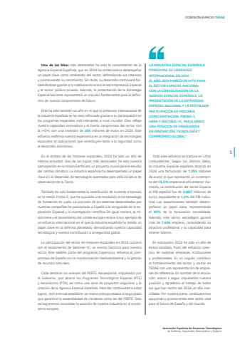 Asociaci%u00f3n Espa%u00f1ola de Empresas Tecnol%u00f3gicas de Defensa, Seguridad, Aeron%u00e1utica y EspacioLA INDUSTRIA ESPACIAL ESPA%u00d1OLA CONSOLIDA SU LIDERAZGO INTERNACIONAL EN 2024EL A%u00d1O 2024 MARC%u00d3 UN HITO PARA EL SECTOR ESPACIAL NACIONAL CON LA CONSOLIDACI%u00d3N DE LA AGENCIA ESPACIAL ESPA%u00d1OLA, LA PRESENTACI%u00d3N DE LA ESTRATEGIA ESPACIAL NACIONAL Y LA DESTACADA PARTICIPACI%u00d3N EN MISIONES COMO EARTHCARE, PROBA-3, HERA Y SENTINEL-1C, REFLEJANDO UNA POSICI%u00d3N DE VANGUARDIA EN INNOVACI%u00d3N, TECNOLOG%u00cdA Y COMPROMISO GLOBAL%u201dUno de los hitos m%u00e1s destacados ha sido la consolidaci%u00f3n de la Agencia Espacial Espa%u00f1ola, que en 2024 ha comenzado a desempe%u00f1ar un papel clave como catalizador del sector, defendiendo sus intereses y promoviendo su crecimiento. Sin duda, su desarrollo continuar%u00e1 fortaleci%u00e9ndose gracias a la colaboraci%u00f3n entre la red empresarial Espacial y el sector p%u00fablico-privado. Adem%u00e1s, la presentaci%u00f3n de la Estrategia Espacial Nacional representar%u00e1 un impulso fundamental para la definici%u00f3n de nuevos compromisos de futuro.Este ha sido tambi%u00e9n un a%u00f1o en el que la presencia internacional de la industria espa%u00f1ola se ha visto reforzada gracias a su participaci%u00f3n en los programas espaciales m%u00e1s relevantes a nivel mundial. Esto refleja nuestra capacidad innovadora y el fuerte compromiso del sector con la I+D+I, con una inversi%u00f3n de 205 millones de euros en 2024. Este esfuerzo reafirma nuestra experiencia en la integraci%u00f3n de tecnolog%u00edas espaciales en aplicaciones que contribuyen tanto a la seguridad como al desarrollo econ%u00f3mico.En el %u00e1mbito de las misiones espaciales, 2024 ha sido un a%u00f1o de intensa actividad. Uno de los logros m%u00e1s destacados ha sido nuestra participaci%u00f3n en la misi%u00f3n EarthCare, un proyecto crucial para el estudio del cambio clim%u00e1tico. La industria espa%u00f1ola ha desempe%u00f1ado un papel clave en el desarrollo de tecnolog%u00edas avanzadas para esta iniciativa de observaci%u00f3n de la Tierra.Tambi%u00e9n ha sido fundamental la contribuci%u00f3n de nuestras empresas en la misi%u00f3n Proba-3, que ha supuesto una revoluci%u00f3n en la tecnolog%u00eda de formaci%u00f3n en vuelo. La precisi%u00f3n de los sistemas desarrollados por nuestras compa%u00f1%u00edas ha posicionado a Espa%u00f1a a la vanguardia de la exploraci%u00f3n Espacial y la investigaci%u00f3n cient%u00edfica. De igual manera, la misi%u00f3n Hera y el lanzamiento del cohete europeo Ariane 6 son ejemplo de un esfuerzo internacional en el que la industria espa%u00f1ola ha tenido un papel clave en la defensa planetaria, demostrando nuestra capacidad tecnol%u00f3gica y nuestra contribuci%u00f3n a la seguridad global.La participaci%u00f3n del sector en misiones espaciales en 2024 culmin%u00f3 con el lanzamiento de Sentinel-1C, un evento hist%u00f3rico para nuestro sector. Este sat%u00e9lite, parte del programa Copernicus, refuerza el compromiso de Espa%u00f1a con la monitorizaci%u00f3n medioambiental y la gesti%u00f3n de recursos naturales.Cabe destacar los avances del PERTE Aeroespacial, impulsados por el Gobierno, que abarca los Programas Tecnol%u00f3gicos Espacial (PTE) y Aeron%u00e1utico (PTA), as%u00ed como una serie de proyectos singulares y la creaci%u00f3n de la Agencia Espacial Espa%u00f1ola. Para dar continuidad a estos logros, ser%u00e1 esencial establecer un marco presupuestario a largo plazo que garantice la sostenibilidad de iniciativas como las del PERTE. Solo as%u00ed lograremos consolidar la posici%u00f3n de nuestra industria en el ecosistema europeo.Todo este esfuerzo se traduce en cifras contundentes. Seg%u00fan los %u00faltimos datos, la industria Espacial espa%u00f1ola alcanz%u00f3 en 2024 una facturaci%u00f3n de 1.293 millones de euros, lo que represent%u00f3 un incremento del 16,5% respecto al a%u00f1o anterior. Asimismo, la contribuci%u00f3n del sector Espacio al PIB espa%u00f1ol fue de 2.087 millones de euros, equivalente al 1,2% del PIB industrial. Las exportaciones tambi%u00e9n desempe%u00f1aron un papel clave, representando el 83% de la facturaci%u00f3n consolidada. Adem%u00e1s, este sector estrat%u00e9gico gener%u00f3 m%u00e1s de 7.636 empleos, consolidando su atractivo profesional y su capacidad para retener talento.En conclusi%u00f3n, 2024 ha sido un a%u00f1o de %u00e9xitos notables, fruto del esfuerzo colectivo de nuestras empresas, instituciones y profesionales. Es un orgullo contribuir al fortalecimiento del sector y contar en TEDAE con una representaci%u00f3n de empresas de referencia. En nombre de la asociaci%u00f3n, animo a seguir impulsando nuestra posici%u00f3n y agradezco el trabajo de todos los que han hecho del 2024 un a%u00f1o inolvidable. Por nuestra parte, continuaremos apoyando y promoviendo este sector vital para el futuro de Espa%u00f1a y del mundo.COMISI%u00d3N ESPACIO TEDAE5
