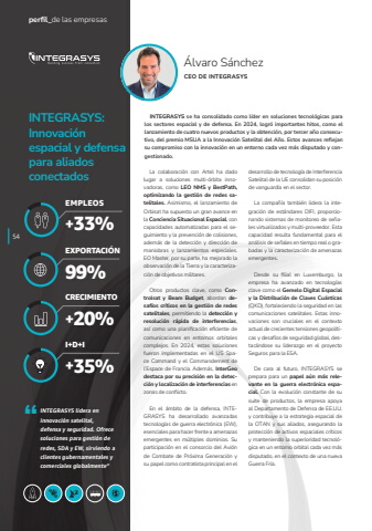 INTEGRASYS: Innovaci%u00f3n espacial y defensa para aliados conectados%u201cINTEGRASYS lidera en innovaci%u00f3n satelital, defensa y seguridad. Ofrece soluciones para gesti%u00f3n de redes, SDA y EW, sirviendo a clientes gubernamentales y comerciales globalmente%u201dINTEGRASYS se ha consolidado como l%u00edder en soluciones tecnol%u00f3gicas para los sectores espacial y de defensa. En 2024, logr%u00f3 importantes hitos, como el lanzamiento de cuatro nuevos productos y la obtenci%u00f3n, por tercer a%u00f1o consecutivo, del premio MSUA a la Innovaci%u00f3n Satelital del A%u00f1o. Estos avances reflejan su compromiso con la innovaci%u00f3n en un entorno cada vez m%u00e1s disputado y congestionado.La colaboraci%u00f3n con Artel ha dado lugar a soluciones multi-%u00f3rbita innovadoras, como LEO NMS y BestPath, optimizando la gesti%u00f3n de redes satelitales. Asimismo, el lanzamiento de Orbisat ha supuesto un gran avance en la Conciencia Situacional Espacial, con capacidades automatizadas para el seguimiento y la prevenci%u00f3n de colisiones, adem%u00e1s de la detecci%u00f3n y direcci%u00f3n de maniobras y lanzamientos especiales. EO Master, por su parte, ha mejorado la observaci%u00f3n de la Tierra y la caracterizaci%u00f3n de objetivos militares.Otros productos clave, como Controlsat y Beam Budget, abordan desaf%u00edos cr%u00edticos en la gesti%u00f3n de redes satelitales, permitiendo la detecci%u00f3n y resoluci%u00f3n r%u00e1pida de interferencias, as%u00ed como una planificaci%u00f3n eficiente de comunicaciones en entornos orbitales complejos. En 2024, estas soluciones fueron implementadas en el US Space Command y el Commandement de l%u2019Espace de Francia. Adem%u00e1s, InterGeo destaca por su precisi%u00f3n en la detecci%u00f3n y localizaci%u00f3n de interferencias en zonas de conflicto.En el %u00e1mbito de la defensa, INTEGRASYS ha desarrollado avanzadas tecnolog%u00edas de guerra electr%u00f3nica (EW), esenciales para hacer frente a amenazas emergentes en m%u00faltiples dominios. Su participaci%u00f3n en el consorcio del Avi%u00f3n de Combate de Pr%u00f3xima Generaci%u00f3n y su papel como contratista principal en el desarrollo de tecnolog%u00eda de Interferencia Satelital de la UE consolidan su posici%u00f3n de vanguardia en el sector.La compa%u00f1%u00eda tambi%u00e9n lidera la integraci%u00f3n de est%u00e1ndares DIFI, proporcionando sistemas de monitoreo de se%u00f1ales virtualizados y multi-proveedor. Esta capacidad resulta fundamental para el an%u00e1lisis de se%u00f1ales en tiempo real o grabadas y la caracterizaci%u00f3n de amenazas emergentes.Desde su filial en Luxemburgo, la empresa ha avanzado en tecnolog%u00edas clave como el Gemelo Digital Espacial y la Distribuci%u00f3n de Claves Cu%u00e1nticas(QKD), fortaleciendo la seguridad en las comunicaciones satelitales. Estas innovaciones son cruciales en el contexto actual de crecientes tensiones geopol%u00edticas y desaf%u00edos de seguridad global, destac%u00e1ndose su liderazgo en el proyecto Seguros para la ESA.De cara al futuro, INTEGRASYS se prepara para un papel a%u00fan m%u00e1s relevante en la guerra electr%u00f3nica espacial. Con la evoluci%u00f3n constante de su suite de productos, la empresa apoya al Departamento de Defensa de EE.UU. y contribuye a la estrategia espacial de la OTAN y sus aliados, asegurando la protecci%u00f3n de activos espaciales cr%u00edticos y manteniendo la superioridad tecnol%u00f3gica en un entorno orbital cada vez m%u00e1s disputado, en el contexto de una nueva Guerra Fr%u00eda.CEO DE INTEGRASYS%u00c1lvaro S%u00e1nchezperfil_de las empresasCRECIMIENTO+20%+33%EMPLEOS99%EXPORTACI%u00d3NI+D+I+35%54