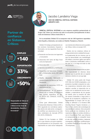 Partner de confianza en Sistemas Cr%u00edticos%u201c Responsable de liderar el crecimiento en Sistemas Cr%u00edticos en las %u00e1reas de Aeron%u00e1utico, Espacio y Ferroviario%u201dORBITAL CRITICAL SYSTEMS es una empresa espa%u00f1ola perteneciente al Grupo CAF. Entre sus servicios de valor se encuentra principalmente el desarrollo de Sistemas Cr%u00edticos hasta DAL-A.En la actualidad, Orbital CS la componen m%u00e1s de 140 ingenieros repartidos entre Espa%u00f1a y Alemania, con sedes en Madrid, Pamplona y Munich.Orbital CS trabaja principalmente en tres sectores: Aeron%u00e1utico, Espacial y Ferroviario, con los siguientes focos de actividad:%u2022 Prestaci%u00f3n de Servicios de Ingenier%u00eda y Consultor%u00eda%u2022 Desarrollo SW tanto de Bajo Nivel como de Aplicaci%u00f3n%u2022 Desarrollo HW%u2022 Servicios de Validaci%u00f3n y Verificaci%u00f3n%u2022 Desarrollos de Soluciones Embebidas y Embarcadas (tanto HW como SW)%u2022 Dise%u00f1o, desarrollo, fabricaci%u00f3n y mantenimiento de Bancos de Test y Simulaci%u00f3n%u2022 Integraci%u00f3n de elementos COTS en soluciones ad-hoc.%u2022 Acompa%u00f1amiento en el aseguramiento de la Calidad de proyectos bajo normas espec%u00edficas de sector (RTCA DO, CENELEC, ECSS o A-SPICE)Como gran diferenciador, Orbital CS desarrolla Sistemas Cr%u00edticos (HW y SW) siguiendo las normativas aplicables dentro de cada sector, consiguiendo certificar sus soluciones en los m%u00e1s altos est%u00e1ndares de mercado (RTCA DO, ECCS, CENELEC).Orbital CS fue fundada en 2008 por lo que atesora una gran experiencia participando en los proyectos m%u00e1s importantes en cada sector trabajando con clientes de referencia como pueden ser Airbus, Indra o el propio CAF.Dentro de los sistemas cr%u00edticos el aseguramiento de la calidad forma parte fundamental de los mismos, por lo que ha desarrollado una metodolog%u00eda de trabajo y procesos agiles que aplica tanto a proyectos certificables como a los que no, a lo largo de toda la vida del producto.En la actualidad dispone de una plantilla especializada en diversas %u00e1reas t%u00e9cnicas que le permite dar un soporte cercano a cliente a la vez que %u00e1gil.Orbital CS como parte del Grupo CAF (M%u00e1s de 15.000 empleados y con presencia mundial) comparte los valores corporativos, teniendo estos como objetivo conciliar el desarrollo de su misi%u00f3n con la satisfacci%u00f3n de las necesidades y expectativas de los grupos de inter%u00e9s, para la creaci%u00f3n de valor de manera sostenible a largo plazo a trav%u00e9s de la excelencia, confianza y la sostenibilidad. El Grupo CAF ha realizado la adhesi%u00f3n a la iniciativa SBti (Science Based Targets Iniciative) y a Race to Zero, dentro de la estrategia de neutralidad de carbono. Esta actuaci%u00f3n forma parte de las iniciativas de alineamiento contra el cambio clim%u00e1tico y con el Acuerdo de Par%u00eds, que refuerza el compromiso de la compa%u00f1%u00eda hacia el reto del cambio clim%u00e1tico, habiendo conseguido, entre otras certificaciones, la medalla Platinum en Ecovadis (Top 1% empresas).CEO DE ORBITAL CRITICAL SISTEMS(GRUPO CAF)Jacobo Landeira Vegaperfil_de las empresasCRECIMIENTO+50%+140EMPLEO33%EXPORTACI%u00d3N58