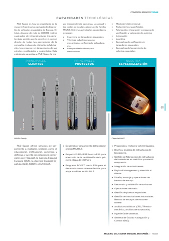 PLD Space es hoy la propietaria de la mayor infraestructura privada de desarrollo de veh%u00edculos espaciales de Europa. En total, dispone de m%u00e1s de 188.000 metros cuadrados de infraestructuras industriales bajo gesti%u00f3n que le permiten el control directo de todas las operaciones de la compa%u00f1%u00eda, incluyendo el dise%u00f1o, la fabricaci%u00f3n, los ensayos y el lanzamiento de sus cohetes reutilizables y sostenibles. Esta estrategia garantiza a PLD Space la mayor independencia operativa, la calidad y los costes de sus lanzadores de la familia MIURA. Entre las principales capacidades destacan:%u2022 Ingenier%u00eda de lanzadores espaciales %u2022 T%u00e9cnicas industriales como mecanizado, conformado, soldadura, etc. %u2022 Ensayos destructivos y no destructivos %u2022 Medici%u00f3n tridimensional %u2022 Tratamientos superficiales %u2022 Fabricaci%u00f3n, integraci%u00f3n y ensayos de verificaci%u00f3n y validaci%u00f3n de avi%u00f3nica %u2022 Integraci%u00f3n %u2022 Log%u00edstica %u2022 Campa%u00f1as de calificaci%u00f3n de lanzadores espaciales %u2022 Campa%u00f1as de lanzamiento de cohetes espaciales %u2022 Desarrollo y lanzamiento del lanzador orbital MIURA 5 %u2022 Proyecto FLPP-LPSR2 con la ESA para el estudio de la reutilizaci%u00f3n de la primera etapa de MIURA 5 %u2022 Programa BOOST! con la ESA para el desarrollo de un sistema flexible para alojar sat%u00e9lites en MIURA 5%u2022 Propulsi%u00f3n y motores-cohete l%u00edquidos. %u2022 Dise%u00f1o y an%u00e1lisis de estructuras de lanzadores. %u2022 Gesti%u00f3n de fabricaci%u00f3n de estructuras de lanzadores en met%u00e1lico y material compuesto. %u2022 Integraci%u00f3n de subsistemas. %u2022 Payload Management y atenci%u00f3n al cliente. %u2022 Dise%u00f1o, montaje y operaciones de bancos de ensayo. %u2022 Desarrollo y validaci%u00f3n de software. %u2022 Operaciones de vuelo. %u2022 Gesti%u00f3n de puertos espaciales. %u2022 Gesti%u00f3n de instalaciones industriales. Bancos de ensayos de motorescohete. %u2022 An%u00e1lisis multif%u00edsicos (CFD, T%u00e9rmicomec%u00e1nico, An%u00e1lisis de trayectoria). %u2022 Ingenier%u00eda de sistemas. %u2022 Sistema de Guiado Navegaci%u00f3n y Control (GNC)PLD Space ofrece servicios de lanzamiento a m%u00faltiples sectores como el educacional, institucional, comercial y defensa, y cuenta con relaciones comerciales con Hispasat, la Agencia Espacial Europea (ESA), la Agencia Espacial Espa%u00f1ola (AEE), ISDEFE o EUMESAT.PRINCIPALESPROYECTOSPRINCIPALESCLIENTESCAPACIDADES TECNOL%u00d3GICASMIURA Family C%u00e1psula LINCENUESTRAESPECIALIZACI%u00d3NANUARIO DEL SECTOR ESPACIAL EN ESPA%u00d1A I TEDAE61COMISI%u00d3N ESPACIO TEDAE