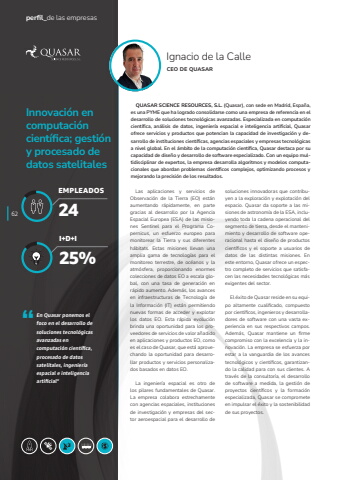 Innovaci%u00f3n en computaci%u00f3n cient%u00edfica; gesti%u00f3n y procesado de datos satelitales%u201c En Quasar ponemos el foco en el desarrollo de soluciones tecnol%u00f3gicas avanzadas en computaci%u00f3n cient%u00edfica, procesado de datos satelitales, ingenier%u00eda espacial e inteligencia artificial%u201dQUASAR SCIENCE RESOURCES, S.L. (Quasar), con sede en Madrid, Espa%u00f1a, es una PYME que ha logrado consolidarse como una empresa de referencia en el desarrollo de soluciones tecnol%u00f3gicas avanzadas. Especializada en computaci%u00f3n cient%u00edfica, an%u00e1lisis de datos, ingenier%u00eda espacial e inteligencia artificial, Quasar ofrece servicios y productos que potencian la capacidad de investigaci%u00f3n y desarrollo de instituciones cient%u00edficas, agencias espaciales y empresas tecnol%u00f3gicas a nivel global. En el %u00e1mbito de la computaci%u00f3n cient%u00edfica, Quasar destaca por su capacidad de dise%u00f1o y desarrollo de software especializado. Con un equipo multidisciplinar de expertos, la empresa desarrolla algoritmos y modelos computacionales que abordan problemas cient%u00edficos complejos, optimizando procesos y mejorando la precisi%u00f3n de los resultados. Las aplicaciones y servicios de Observaci%u00f3n de la Tierra (EO) est%u00e1n aumentando r%u00e1pidamente, en parte gracias al desarrollo por la Agencia Espacial Europea (ESA) de las misiones Sentinel para el Programa Copernicus, un esfuerzo europeo para monitorear la Tierra y sus diferentes h%u00e1bitats. Estas misiones llevan una amplia gama de tecnolog%u00edas para el monitoreo terrestre, de oc%u00e9anos y la atm%u00f3sfera, proporcionando enormes colecciones de datos EO a escala global, con una tasa de generaci%u00f3n en r%u00e1pido aumento. Adem%u00e1s, los avances en infraestructuras de Tecnolog%u00eda de la Informaci%u00f3n (IT) est%u00e1n permitiendo nuevas formas de acceder y explotar los datos EO. Esta r%u00e1pida evoluci%u00f3n brinda una oportunidad para los proveedores de servicios de valor a%u00f1adido en aplicaciones y productos EO, como es el caso de Quasar, que est%u00e1 aprovechando la oportunidad para desarrollar productos y servicios personalizados basados en datos EO.La ingenier%u00eda espacial es otro de los pilares fundamentales de Quasar. La empresa colabora estrechamente con agencias espaciales, instituciones de investigaci%u00f3n y empresas del sector aeroespacial para el desarrollo de soluciones innovadoras que contribuyen a la exploraci%u00f3n y explotaci%u00f3n del espacio. Quasar da soporte a las misiones de astronom%u00eda de la ESA, incluyendo toda la cadena operacional del segmento de tierra, desde el mantenimiento y desarrollo de software operacional hasta el dise%u00f1o de productos cient%u00edficos y el soporte a usuarios de datos de las distintas misiones. En este entorno, Quasar ofrece un espectro completo de servicios que satisfacen las necesidades tecnol%u00f3gicas m%u00e1s exigentes del sector.El %u00e9xito de Quasar reside en su equipo altamente cualificado, compuesto por cient%u00edficos, ingenieros y desarrolladores de software con una vasta experiencia en sus respectivos campos. Adem%u00e1s, Quasar mantiene un firme compromiso con la excelencia y la innovaci%u00f3n. La empresa se esfuerza por estar a la vanguardia de los avances tecnol%u00f3gicos y cient%u00edficos, garantizando la calidad para con sus clientes. A trav%u00e9s de la consultor%u00eda, el desarrollo de software a medida, la gesti%u00f3n de proyectos cient%u00edficos y la formaci%u00f3n especializada, Quasar se compromete en impulsar el %u00e9xito y la sostenibilidad de sus proyectos.CEO DE QUASARIgnacio de la Calleperfil_de las empresas24EMPLEADOSI+D+I25%62