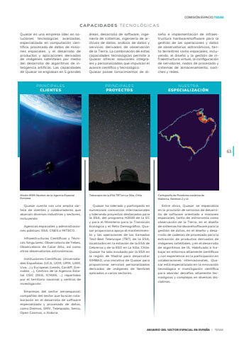 Quasar es una empresa l%u00edder en soluciones tecnol%u00f3gicas avanzadas, especializada en computaci%u00f3n cient%u00edfica, procesado de datos de misiones espaciales, y el desarrollo de productos y aplicaciones derivadas de im%u00e1genes satelitales por medio del desarrollo de algoritmos de inteligencia artificial. Las capacidades de Quasar se engloban en 5 grandes %u00e1reas, desarrollo de software, ingenier%u00eda de sistemas, ingenier%u00eda de archivos de datos, an%u00e1lisis de datos y servicios derivados de observaci%u00f3n de la Tierra. La combinaci%u00f3n de estas capacidades tecnol%u00f3gicas permite a Quasar ofrecer soluciones integrales y personalizadas que impulsan el avance cient%u00edfico y tecnol%u00f3gico.Quasar posee conocimientos de dise%u00f1o e implementaci%u00f3n de infraestructura hardware/software para la gesti%u00f3n de las operaciones y datos de observatorios astron%u00f3micos, tanto terrestres como espaciales, incluyendo, el dise%u00f1o y la gesti%u00f3n de infraestructura virtual, la configuraci%u00f3n de servidores, nodos de procesado y sistemas de almacenamiento, switches y redes.Quasar ha liderado y participado en numerosos consorcios internacionales y liderando proyectos destacados para la ESA, del programa H2020 de la EC y para el Ministerio para la Transici%u00f3n Ecol%u00f3gica y el Reto Demogr%u00e1fico. Quasar proporciona apoyo al mantenimiento y las operaciones de los llamados Test-Bed Telescope (TBT) de la ESA, localizados en la estaci%u00f3n de la ESA de Cebreros y de la ESO en La Silla, Chile. Quasar ha sido incubado por la ESA en la regi%u00f3n de Madrid para desarrollar SIMBAD, una iniciativa de Quasar para proporcionar servicios personalizados derivados de im%u00e1genes de Sentinel aplicados a varios sectores.Entre otros, Quasar se especializa en la provisi%u00f3n de servicios de desarrollo de software orientado a misiones espaciales, tanto de astronom%u00eda como observaci%u00f3n de la Tierra, en el dise%u00f1o de sistemas hardware/software para la gesti%u00f3n de datos, en el dise%u00f1o y desarrollo de cadenas de procesado para la extracci%u00f3n de productos derivados de im%u00e1genes satelitales, y en el desarrollo de algoritmos de IA. Habituado a trabajar en entornos altamente cient%u00edficos y con experiencia en la participaci%u00f3n en colaboraciones internacionales, Quasar est%u00e1 especializado en la innovaci%u00f3n tecnol%u00f3gica e investigaci%u00f3n cient%u00edfica para abordar desaf%u00edos altamente tecnol%u00f3gicos y complejos en diversas disciplinas.Quasar cuenta con una amplia cartera de clientes y colaboradores que abarcan diversas industrias y sectores, incluyendo:Agencias espaciales y administraciones p%u00fablicas: ESA, CNES o MITECO.Infraestructuras Cient%u00edficas y T%u00e9cnicas Singulares: Observatorio de Yebes, Observatorio de Calar Alto, as%u00ed como otros observatorios astron%u00f3micos.Instituciones Cient%u00edficas: Universidades Espa%u00f1olas (UCA, UCM, UPM, UAM, Uva, ..) y Europeas (Leeds, Cardiff, Grenoble, %u2026), Centros de la Agencia Estatal CSIC (INIA, ICMAN, %u2026) repartidos por el territorio nacional y centros de investigaci%u00f3n. Empresas del sector aeroespacial: compa%u00f1%u00edas del sector que buscan colaboraci%u00f3n en el desarrollo de software especializado y procesado de datos, como Deimos, GMV, Telespazio, Serco, Open Cosmos, o Aldoria.PRINCIPALESPROYECTOSPRINCIPALESCLIENTESCAPACIDADES TECNOL%u00d3GICASNUESTRAESPECIALIZACI%u00d3NANUARIO DEL SECTOR ESPACIAL EN ESPA%u00d1A I TEDAEMisi%u00f3n XMM-Newton de la Agencia Espacial EuropeaTelescopio de la ESA TBT en La Silla, Chile Cartograf%u00eda de Posidonia oce%u00e1nica de Mallorca, Sentinel-2 y IA63COMISI%u00d3N ESPACIO TEDAE