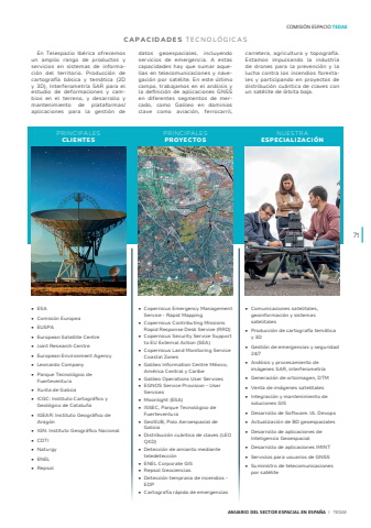 ANUARIO DEL SECTOR ESPACIAL EN ESPA%u00d1A I TEDAEEn Telespazio Ib%u00e9rica ofrecemos un amplio rango de productos y servicios en sistemas de informaci%u00f3n del territorio. Producci%u00f3n de cartograf%u00eda b%u00e1sica y tem%u00e1tica (2D y 3D), Interferometr%u00eda SAR para el estudio de deformaciones y cambios en el terreno, y desarrollo y mantenimiento de plataformas/aplicaciones para la gesti%u00f3n de datos geoespaciales, incluyendo servicios de emergencia. A estas capacidades hay que sumar aquellas en telecomunicaciones y navegaci%u00f3n por sat%u00e9lite. En este %u00faltimo campo, trabajamos en el an%u00e1lisis y la definici%u00f3n de aplicaciones GNSS en diferentes segmentos de mercado, como Galileo en dominios clave como aviaci%u00f3n, ferrocarril, carretera, agricultura y topograf%u00eda. Estamos impulsando la industria de drones para la prevenci%u00f3n y la lucha contra los incendios forestales y participando en proyectos de distribuci%u00f3n cu%u00e1ntica de claves con un sat%u00e9lite de %u00f3rbita baja.%u2022 Copernicus Emergency Management Service - Rapid Mapping%u2022 Copernicus Contributing Missions Rapid Response Desk Service (RRD)%u2022 Copernicus Security Service Support to EU External Action (SEA)%u2022 Copernicus Land Monitoring Service Coastal Zones%u2022 Galileo Information Centre M%u00e9xico, Am%u00e9rica Central y Caribe%u2022 Galileo Operations User Services%u2022 EGNOS Service Provision %u2013 User Services%u2022 Moonlight (ESA)%u2022 ISSEC, Parque Tecnol%u00f3gico de Fuerteventura%u2022 GeoSUB, Polo Aeroespacial de Galicia%u2022 Distribuci%u00f3n cu%u00e1ntica de claves (LEO QKD)%u2022 Detecci%u00f3n de amianto mediante teledetecci%u00f3n%u2022 ENEL Corporate GIS%u2022 Repsol Geociencias %u2022 Detecci%u00f3n temprana de incendios - EDP%u2022 Cartograf%u00eda r%u00e1pida de emergencias%u2022 Comunicaciones satelitales, geoinformaci%u00f3n y sistemas satelitales%u2022 Producci%u00f3n de cartograf%u00eda tem%u00e1tica y 3D%u2022 Gesti%u00f3n de emergencias y seguridad 24/7 %u2022 An%u00e1lisis y procesamiento de im%u00e1genes SAR, interferometr%u00eda%u2022 Generaci%u00f3n de ortoimagen, DTM%u2022 Venta de im%u00e1genes satelitales %u2022 Integraci%u00f3n y mantenimiento de soluciones GIS %u2022 Desarrollo de Software. IA. Devops%u2022 Actualizaci%u00f3n de BD geoespaciales%u2022 Desarrollo de aplicaciones de Inteligencia Geoespacial%u2022 Desarrollo de aplicaciones IMINT%u2022 Servicios para usuarios de GNSS%u2022 Suministro de telecomunicaciones por sat%u00e9lite%u2022 ESA %u2022 Comisi%u00f3n Europea %u2022 EUSPA%u2022 European Satellite Centre %u2022 Joint Research Centre %u2022 European Environment Agency %u2022 Leonardo Company%u2022 Parque Tecnol%u00f3gico de Fuerteventura%u2022 Xunta de Galicia%u2022 ICGC: Instituto Cartogr%u00e1fico y Geol%u00f3gico de Catalu%u00f1a%u2022 IGEAR: Instituto Geogr%u00e1fico de Arag%u00f3n%u2022 IGN: Instituto Geogr%u00e1fico Nacional%u2022 CDTI%u2022 Naturgy%u2022 ENEL %u2022 RepsolPRINCIPALESPROYECTOSPRINCIPALESCLIENTESCAPACIDADES TECNOL%u00d3GICASNUESTRAESPECIALIZACI%u00d3N71COMISI%u00d3N ESPACIO TEDAE