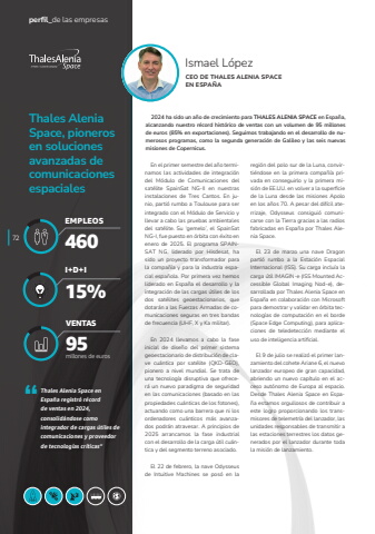 Thales Alenia Space, pioneros en soluciones avanzadas de comunicaciones espaciales %u201c Thales Alenia Space en Espa%u00f1a registr%u00f3 r%u00e9cord de ventas en 2024, consolid%u00e1ndose como integrador de cargas %u00fatiles de comunicaciones y proveedor de tecnolog%u00edas cr%u00edticas%u201d2024 ha sido un a%u00f1o de crecimiento para THALES ALENIA SPACE en Espa%u00f1a, alcanzando nuestro r%u00e9cord hist%u00f3rico de ventas con un volumen de 95 millones de euros (85% en exportaciones). Seguimos trabajando en el desarrollo de numerosos programas, como la segunda generaci%u00f3n de Galileo y las seis nuevas misiones de Copernicus.En el primer semestre del a%u00f1o terminamos las actividades de integraci%u00f3n del M%u00f3dulo de Comunicaciones del sat%u00e9lite SpainSat NG-II en nuestras instalaciones de Tres Cantos. En junio, parti%u00f3 rumbo a Toulouse para ser integrado con el M%u00f3dulo de Servicio y llevar a cabo las pruebas ambientales del sat%u00e9lite. Su %u2018gemelo%u2019, el SpainSat NG-I, fue puesto en %u00f3rbita con %u00e9xito en enero de 2025. El programa SPAINSAT NG, liderado por Hisdesat, ha sido un proyecto transformador para la compa%u00f1%u00eda y para la industria espacial espa%u00f1ola. Por primera vez hemos liderado en Espa%u00f1a el desarrollo y la integraci%u00f3n de las cargas %u00fatiles de los dos sat%u00e9lites geoestacionarios, que dotar%u00e1n a las Fuerzas Armadas de comunicaciones seguras en tres bandas de frecuencia (UHF, X y Ka militar).En 2024 llevamos a cabo la fase inicial de dise%u00f1o del primer sistema geoestacionario de distribuci%u00f3n de clave cu%u00e1ntica por sat%u00e9lite (QKD-GEO), pionero a nivel mundial. Se trata de una tecnolog%u00eda disruptiva que ofrecer%u00e1 un nuevo paradigma de seguridad en las comunicaciones (basado en las propiedades cu%u00e1nticas de los fotones), actuando como una barrera que ni los ordenadores cu%u00e1nticos m%u00e1s avanzados podr%u00e1n atravesar. A principios de 2025 arrancamos la fase industrial con el desarrollo de la carga %u00fatil cu%u00e1ntica y del segmento terreno asociado. El 22 de febrero, la nave Odysseus de Intuitive Machines se pos%u00f3 en la regi%u00f3n del polo sur de la Luna, convirti%u00e9ndose en la primera compa%u00f1%u00eda privada en conseguirlo y la primera misi%u00f3n de EE.UU. en volver a la superficie de la Luna desde las misiones Apolo en los a%u00f1os 70. A pesar del dif%u00edcil aterrizaje, Odysseus consigui%u00f3 comunicarse con la Tierra gracias a las radios fabricadas en Espa%u00f1a por Thales Alenia Space. El 23 de marzo una nave Dragon parti%u00f3 rumbo a la Estaci%u00f3n Espacial Internacional (ISS). Su carga inclu%u00eda la carga %u00fatil IMAGIN-e (ISS Mounted Accessible Global Imaging Nod-e), desarrollada por Thales Alenia Space en Espa%u00f1a en colaboraci%u00f3n con Microsoft para demostrar y validar en %u00f3rbita tecnolog%u00edas de computaci%u00f3n en el borde (Space Edge Computing), para aplicaciones de teledetecci%u00f3n mediante el uso de inteligencia artificial.El 9 de julio se realiz%u00f3 el primer lanzamiento del cohete Ariane 6, el nuevo lanzador europeo de gran capacidad, abriendo un nuevo cap%u00edtulo en el acceso aut%u00f3nomo de Europa al espacio. Desde Thales Alenia Space en Espa%u00f1a estamos orgullosos de contribuir a este logro proporcionando los transmisores de telemetr%u00eda del lanzador, las unidades responsables de transmitir a las estaciones terrestres los datos generados por el lanzador durante toda la misi%u00f3n de lanzamiento.CEO DE THALES ALENIA SPACE EN ESPA%u00d1AIsmael L%u00f3pezperfil_de las empresas15%I+D+I460EMPLEOSVENTAS95millones de euros72